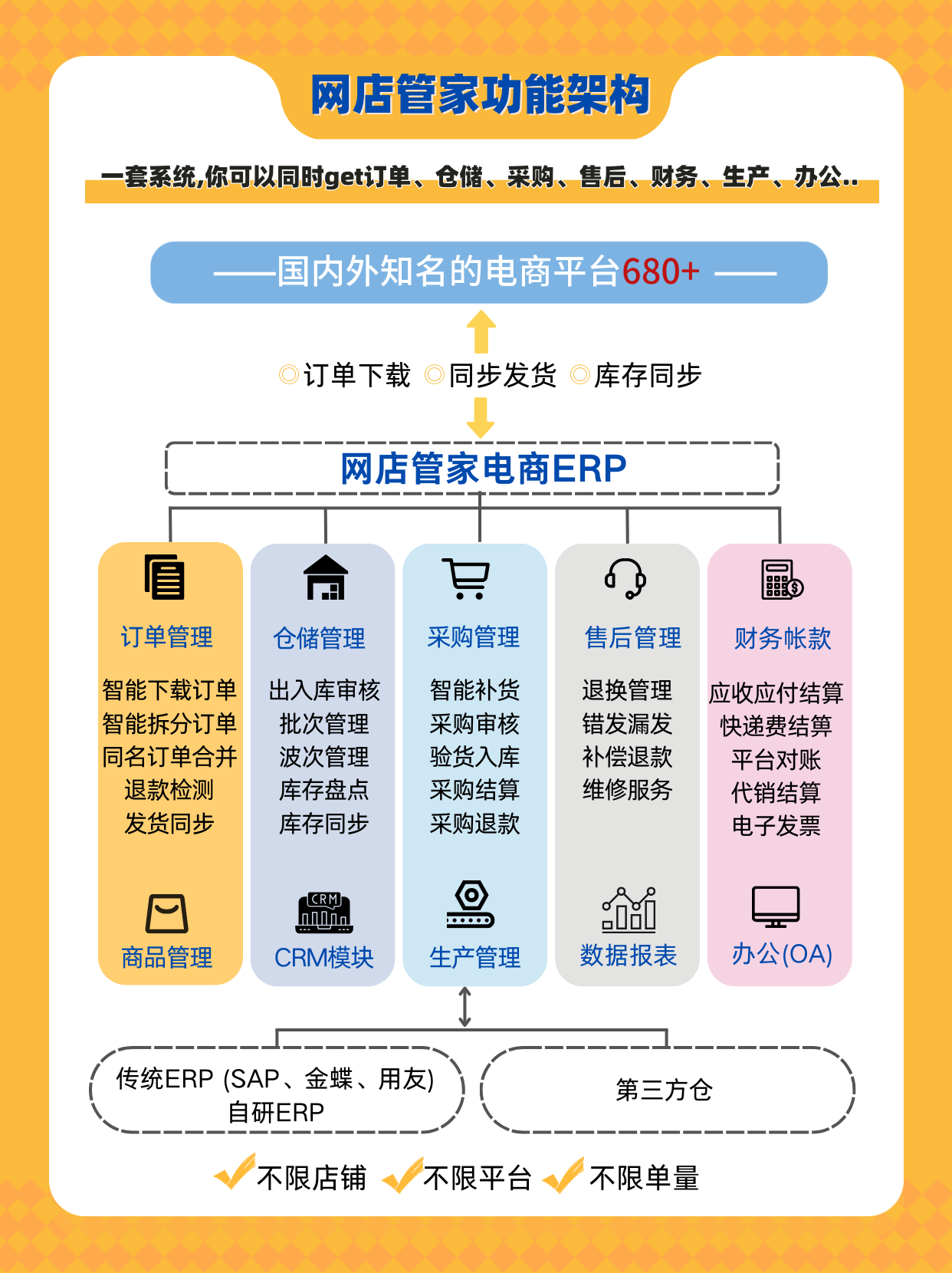 功能全面,满足多样化需求: 网店管家ERP涵盖了订单管理、库存管理、采购管理、财务管理、客户关系管理等电商运营的各个环节,并提供丰富的API接口,支持与其他系统无缝对接,满足企业多样化的需求。